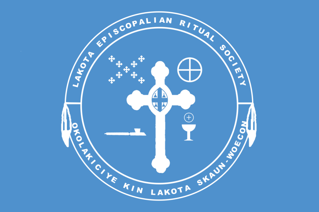 The Lakota Episcopalian Ritual Society is identifiable by the seal and flag, whose elements are rooted in hundreds and, ultimately, thousands of years of Lakota and Christian history. They show the Society’s allegiance to both the Lakota Nation and the Episcopal Church and the traditions of both. The flag displays the seal, with the name of the Society and eagle feathers.