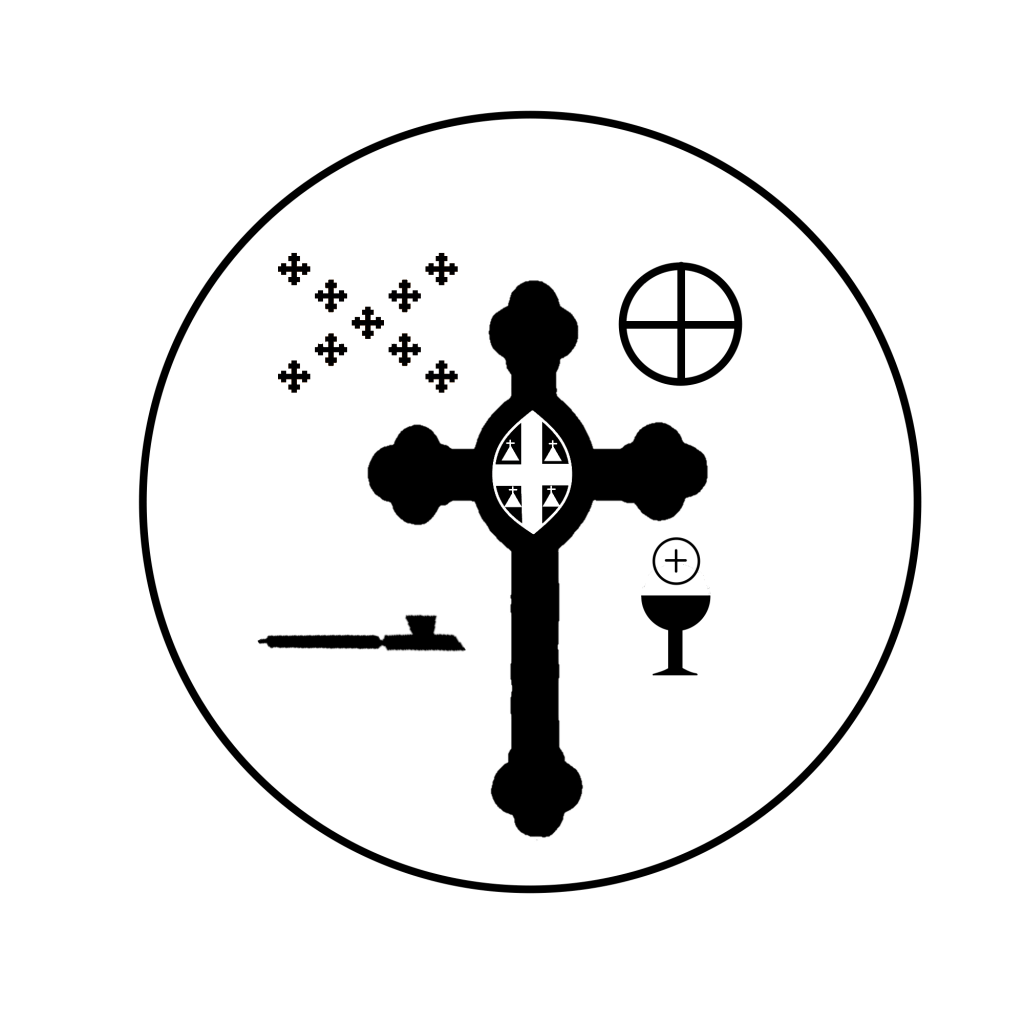 The seal features most prominently a silhouetted Niobrara cross, which is the symbol of Lakota and Dakota Episcopalians going back to the late 19th century. Designed by Bishop William Hobart Hare, it was given as a sign of tribal Episcopalians’ baptism. The nine-cross grouping on the top left are from the Episcopal flag and represent the adherence of the Society to the rites of the Episcopal Church. The symbol on the top right represents the sacred hoop of life, the Lakota symbol of unity and balance (it may be called a “medicine wheel” as well). The pipe, chalice and host represent the two sides of the Society’s practices, Lakota and Episcopalian.